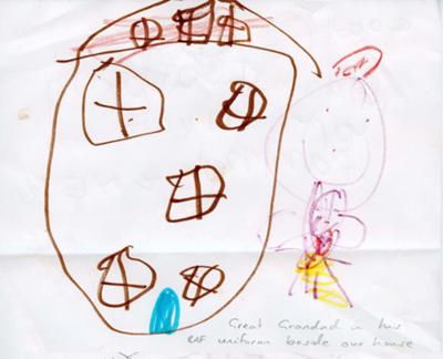 Great Granddad (Fred Dinning) in his RAF uniform outside our house by Matt aged 4. Great Granddad was a rigger in the RAF. It was his job to look after the aeroplanes when they were on the ground. He worked with some of the men who went on to form the Dambusters Squadron, made famous by the movie. He used to show us photos of them. We have an old photograph of Fred in his RAF uniform and Matthew used it to draw a picture of him outside our house.